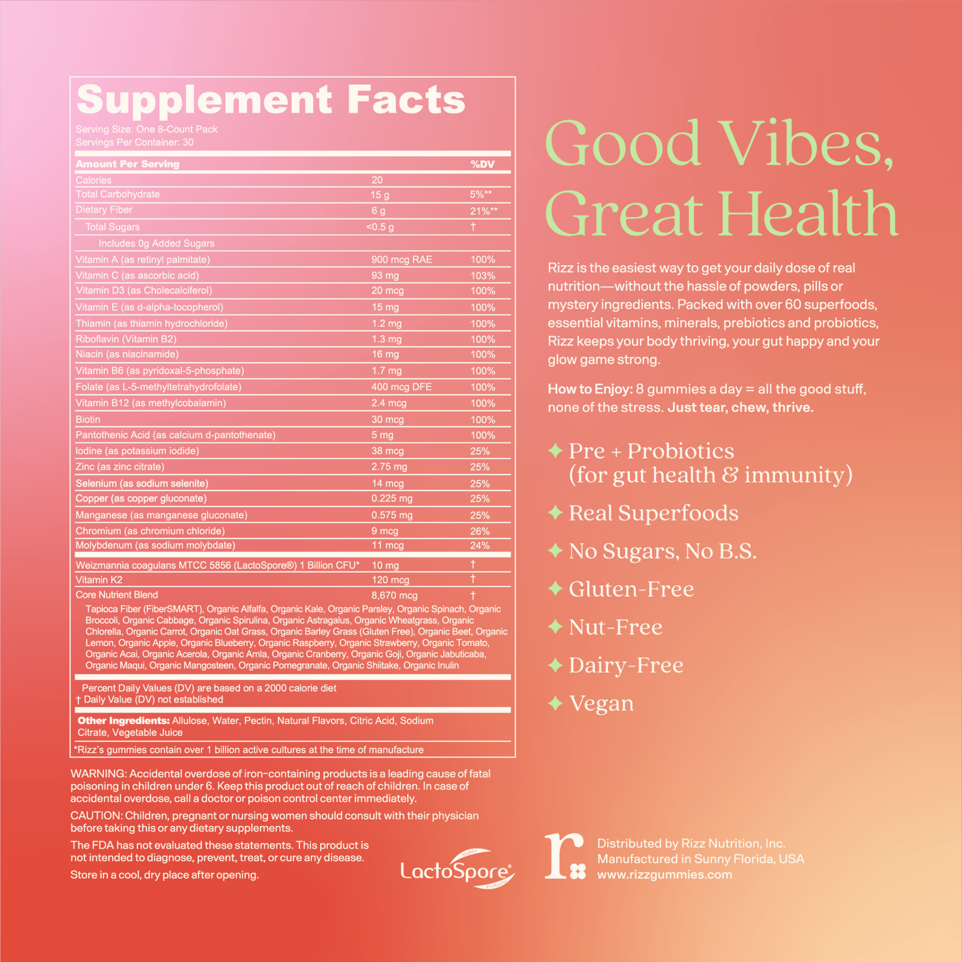 Each bag of Rizz contains 30 gummy packs to ensure month-long wellness. Inside each pack, you’ll find 8 gummies that are easy and delicious to take for all-day Rizz.